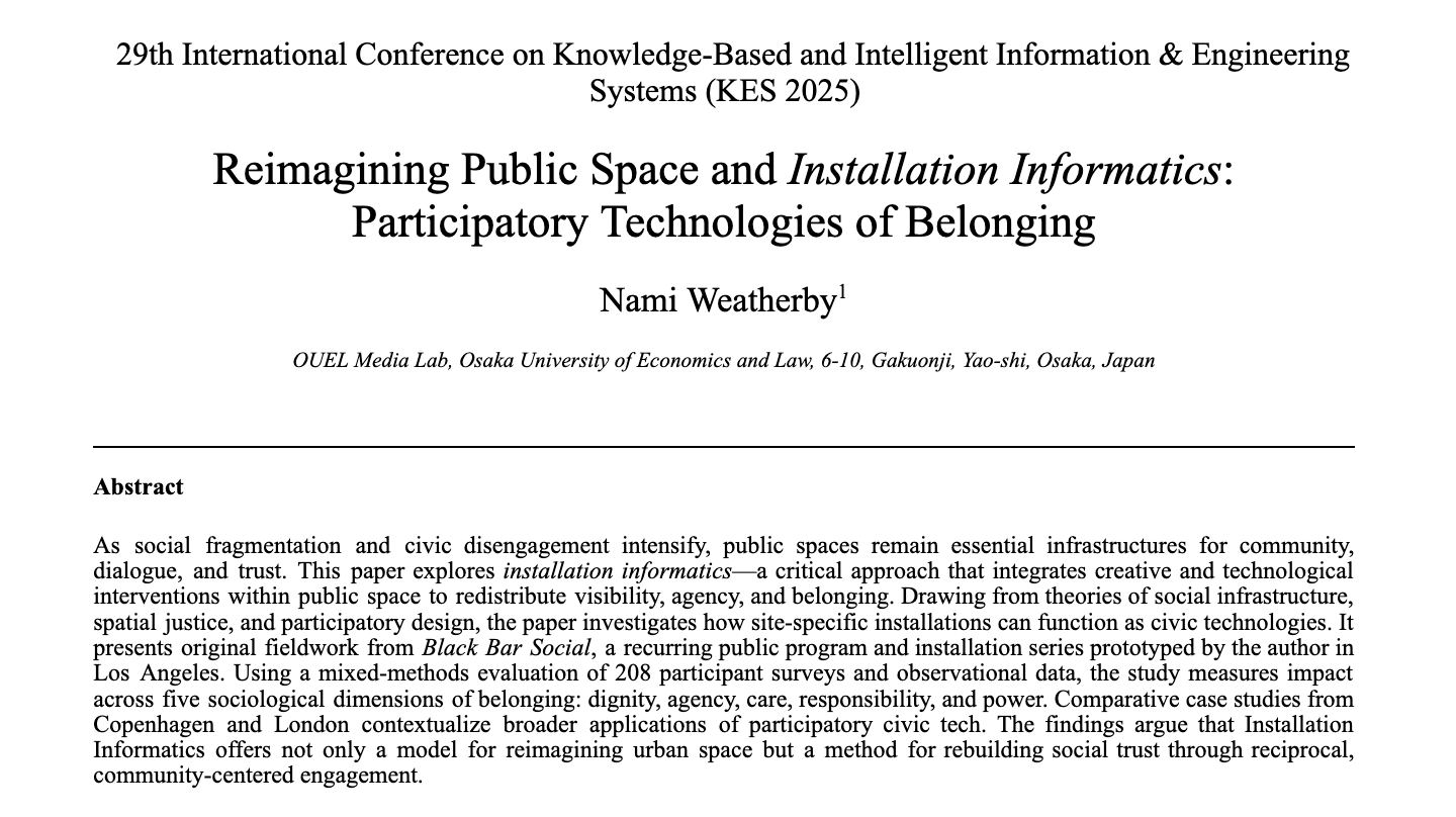 Abstract: As social fragmentation and civic disengagement intensify, public spaces remain essential infrastructures for community, dialogue, and trust. This paper explores installation informatics—a critical approach that integrates creative and technological interventions within public space to redistribute visibility, agency, and belonging. Drawing from theories of social infrastructure, spatial justice, and participatory design, the paper investigates how site-specific installations can function as civic technologies. It presents original fieldwork from Black Bar Social, a recurring public program and installation series prototyped by the author in Los Angeles. Using a mixed-methods evaluation of 208 participant surveys and observational data, the study measures impact across five sociological dimensions of belonging: dignity, agency, care, responsibility, and power. Comparative case studies from Copenhagen and London contextualize broader applications of participatory civic tech. The findings argue that Installation Informatics offers not only a model for reimagining urban space but a method for rebuilding social trust through reciprocal, community-centered engagement.